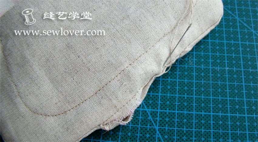 Then spread the back lining cloth on it, align the surrounding edges and sew a circle, leaving a 7 or 8 cm long return mouth in the center of the bottom→